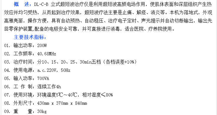 BA-CD-II型超短波電療機,在功能上對比傳統的超短波電療機進行了多項改進。該產品將輸出的高頻電場作用于人體病灶部位,通過超短波高頻電磁振蕩效應、熱效應和非熱效應,對腦、脊髓的各種炎癥性消炎;使深度內臟血管擴張;促進胃腸分泌和吸收,解除胃腸痙攣;解除腎血管痙攣,有顯著的利尿作用;促進肉芽組織和結蒂組織再生;對消除炎癥有良好的作用,特別是可以使用本產品的脈沖功能,治療急性化膿性炎癥。
