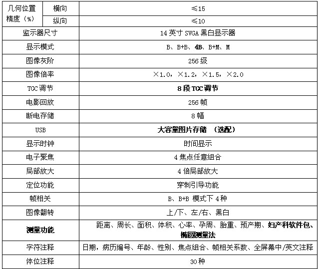 1. 逐行掃描,視頻輸出,VGA逐行輸出.   2.數字變頻插孔具有4種變頻接受,可直接配接高頻探頭   3.電影回放,256幅存儲回放.。增益控制,遠場近場連續可調。   4.局部放大功能,7種偽彩處理,行相關,幀相關,線性內插等   5.穿刺引導功能,定位線功能,8種伽瑪校正   6.測量:距離,面積,周長,孕周,預產期,心率等   7.深度提升,圖像翻轉,后置處理,凍結圖像,邊緣增強等功能.   8.顯示內容:時間,計測值,胎齡,倍率,體標,心率等.   9. 計算機B超工作站具有檢查,存儲,打印圖文報告,支持遠程會診的功能,   方便客戶 管理病源資料,有利于防止醫患糾紛。   10. 增加了胃腸超聲檢查功能,通過胃腸顯影液檢測胃腸疾病,減除病人   胃鏡插管的痛苦,對腫瘤性,炎性,潰瘍性胃腸病變及先天性畸形,胃   下垂等準確診斷。