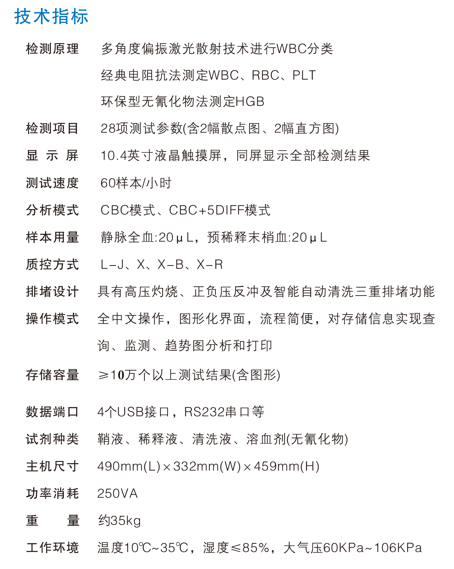 工作原理:電阻抗法計(jì)數(shù),不含氰化物的SFT檢測(cè)血紅蛋白