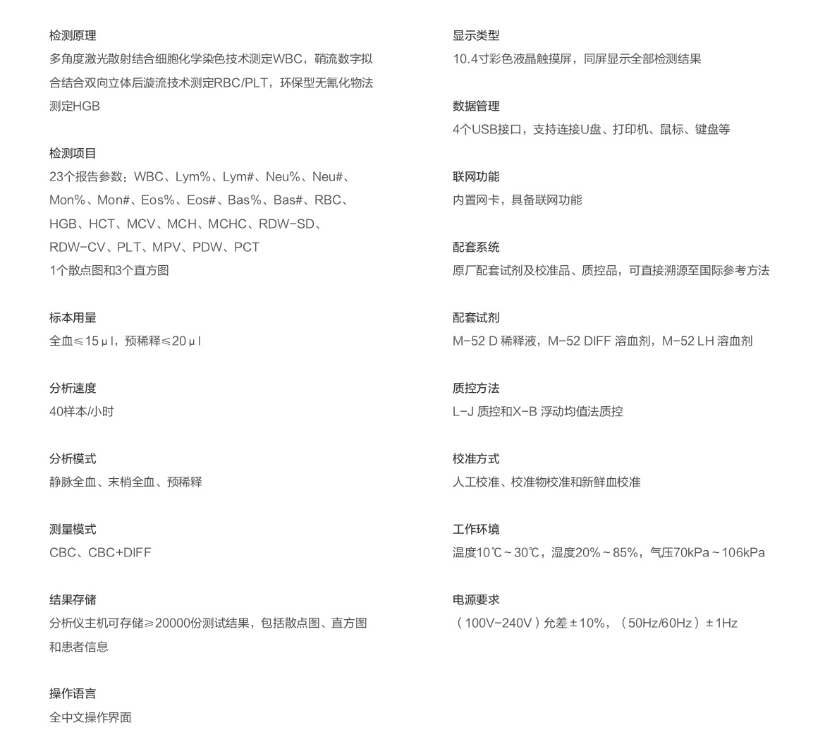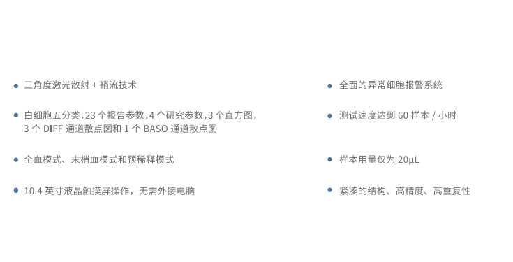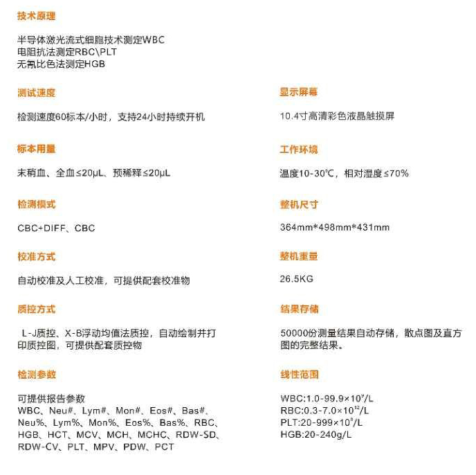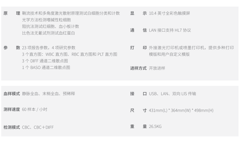 * 檢測(cè)參數(shù):白細(xì)胞三分群,提供精確的23項(xiàng)參數(shù)(含WBC、RBC、 PLT彩色直方圖)