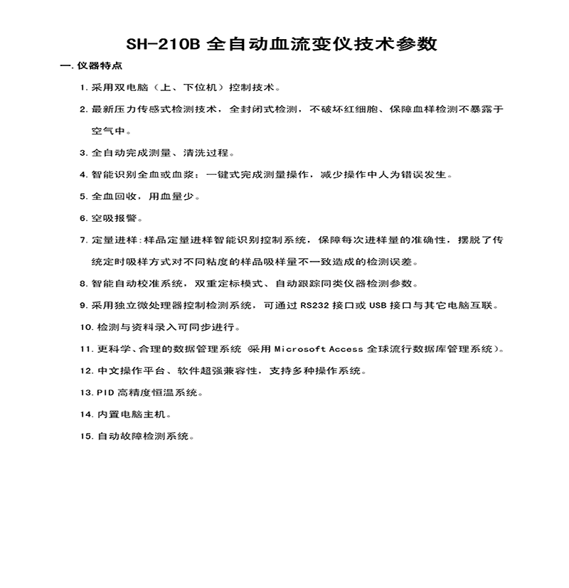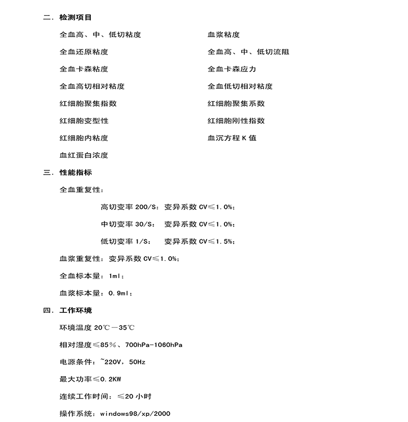 檢測19個參數(shù):全血高、中、低切粘度、血漿粘度、全血還原粘度、全血高、中、低切流阻、全血卡森粘度、全血 卡森應(yīng)力、全血高切相對粘度、全血低切相對粘度、紅細(xì)胞聚集指數(shù)、紅細(xì)胞聚集系數(shù)、紅細(xì)胞變型性、紅細(xì)胞剛性指數(shù)、紅細(xì)胞內(nèi)粘度、血沉方程K值、血紅蛋白濃度。