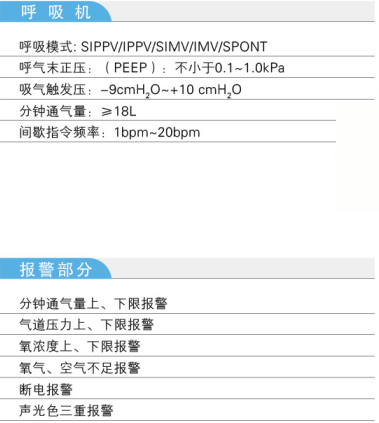 30、報警功能:具有聲光報警,通氣量上限報警,潮氣量上下限報警,氣道壓力上下限報警,氧氣供應低報警,電源故障報警等。