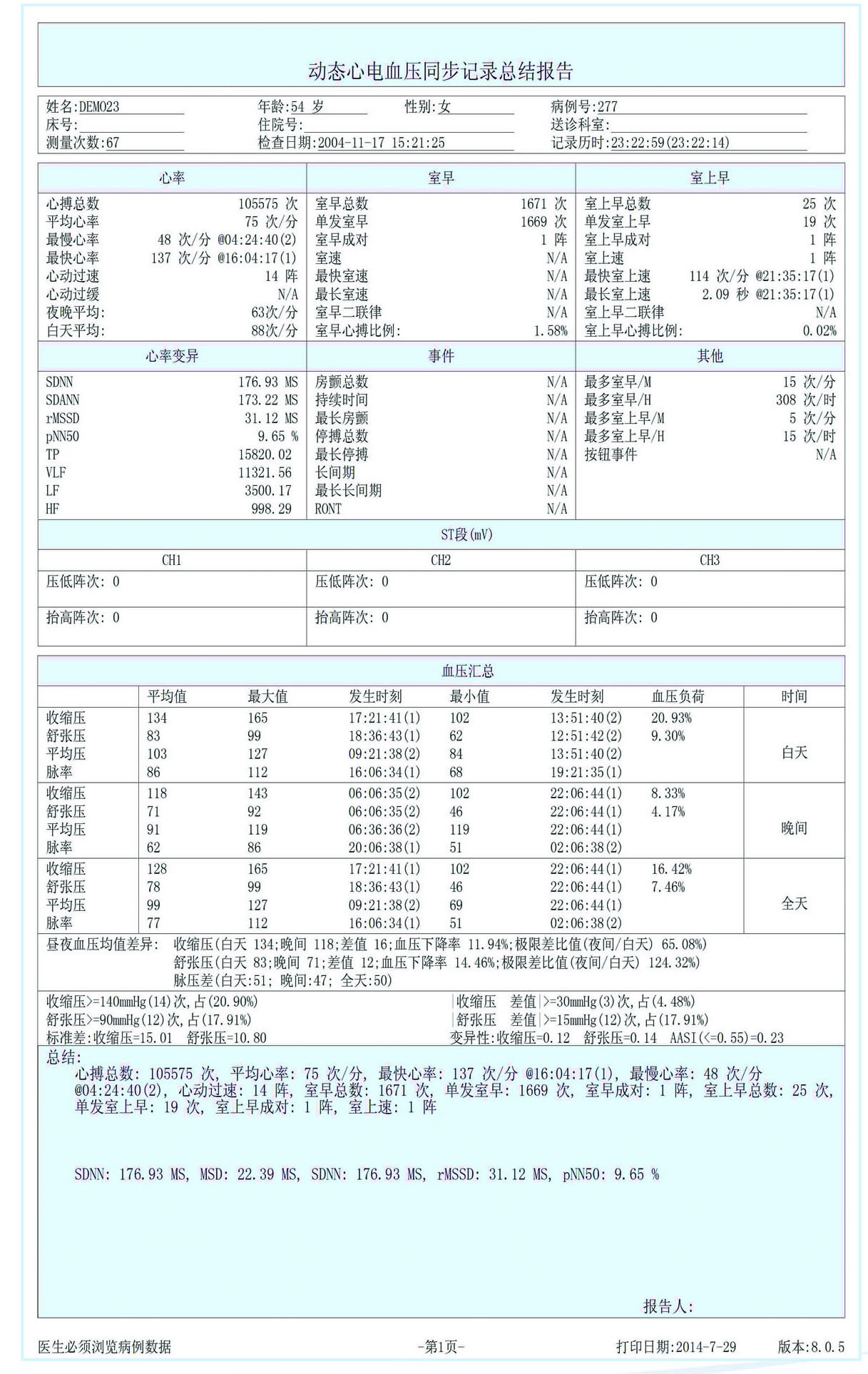 ● 準確識別QRS波,全模板覆蓋,共分為室性、室上性、正常和干擾四大類,全天任何一個QRS波都被分類標識,并打上標記,保證了分析結果的透明性,也便于鑒別軟件識別水平,決無濫竽充數之嫌。