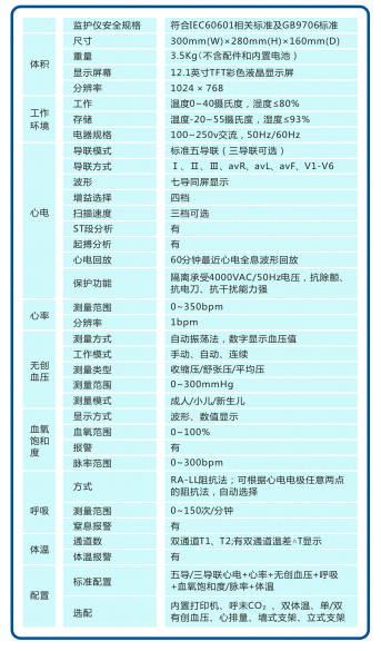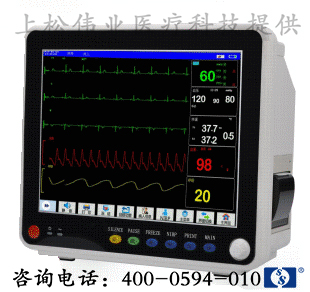 10、單通道/3通道/ (3+R)通道/(3+Ⅱ+V5)通道/雙列6通道/單列6通道/雙列12通道/單列12通道八種心電顯示組合模式;
