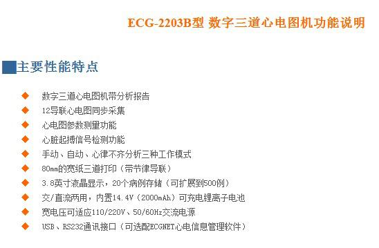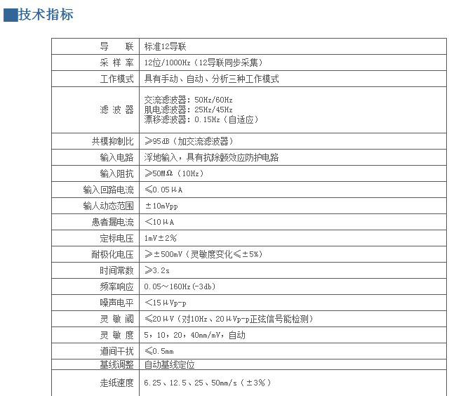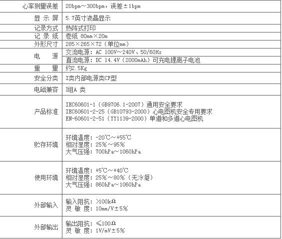 一、功能介紹 1、7寸480x680彩色圖形液晶顯示器 2、 12導聯心電圖同步采集 3、多種操作模式:手動/自動/心律失常分析模式 4、80毫米3聲道錄音有節奏鉛 5、數碼濾波器消除EMG , AC ,基線漂移干擾 6、內置可充電鋰離子電池,3個小時的連續工作 7、適應110-240V , 50 / 60Hz的交流電源 8、200例患者保存/重放 9、內置的SB / RS232接口 二、技術參數