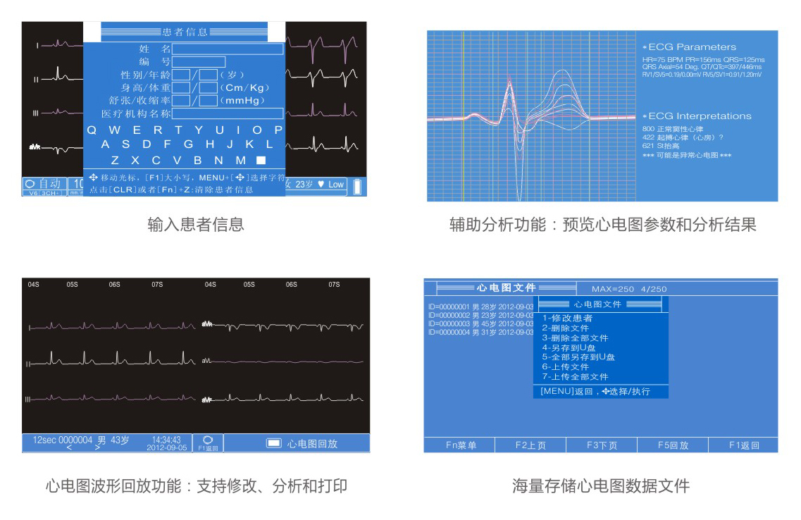 產品技術指標 1、彩屏7寸(800x480)液晶顯示屏 2、內置可充電鋰電池,可待機10小時,持續打印3小時,連續打印300份心電圖。 3、自動模式下支持回放前10秒的心電圖,可快速打印、節約打印紙 4、支持全鍵盤中文拼音、五筆輸入病人和醫院信息 5、可直接通過USB、RS232進行文件另存、外接打印及上傳到ECGNET管理軟件上 6、適用小兒、急診、救護車等急救場合,無特殊使用環境限制 7、手動、自動、節律、存儲四種工作模式