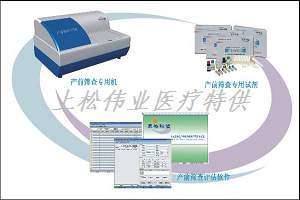 唐氏綜合征和神經管缺陷產前篩查系統為孕婦在孕早期和孕中期提供唐氏綜合征及神經管畸形產前篩查。該系統孕早期采用二聯(PAPPA+F-β?h),孕中期采用兩聯(AFP+ F-βhCG)母體血清檢測方法,定量檢測孕婦血清中AFP(甲胎蛋白)、F-βHCG(游離人絨毛膜促性腺激素)及PAPPA(妊娠相關蛋白)水平,然后根據孕周、孕婦年齡等因素和上述指標,通過專業軟件運用統計學方法預測出該孕婦生唐氏綜合征和神經管畸形患兒的風險率,以確定是否需要進行進一步的診斷檢查。
