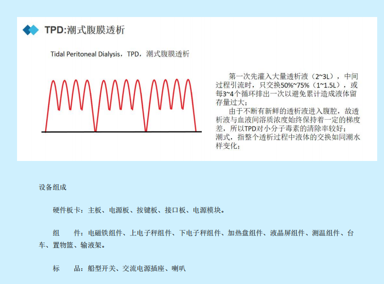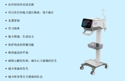 液晶觸摸屏幕,方便識讀 具有開放式設置功能的操作系統 腹膜透析管路一次連接,減少感染風險 設備操作簡單易學 24小時技術支持