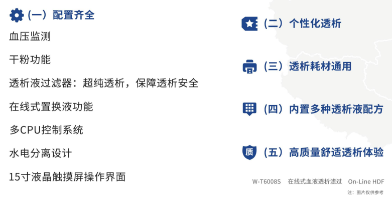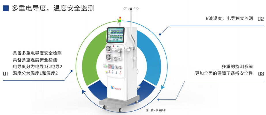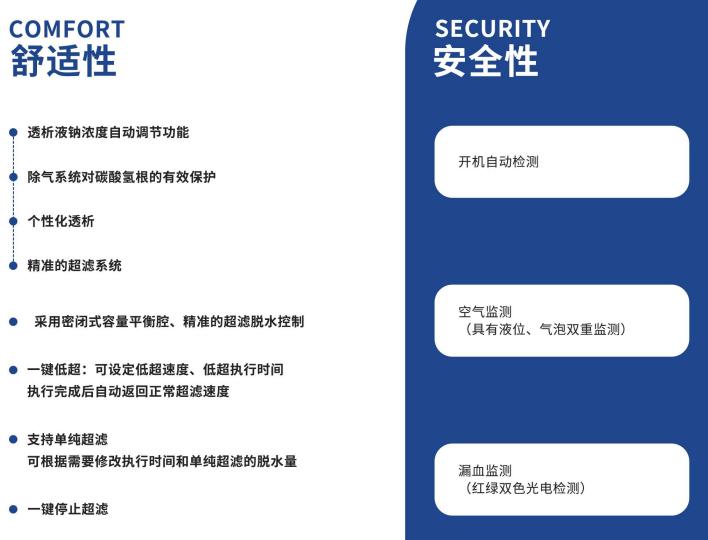 — 溫度超溫提示,自動停止加熱 — 實時監測管路中氣泡,如發現自動排除 — 透析液注入量與排出量不足時,系統提示