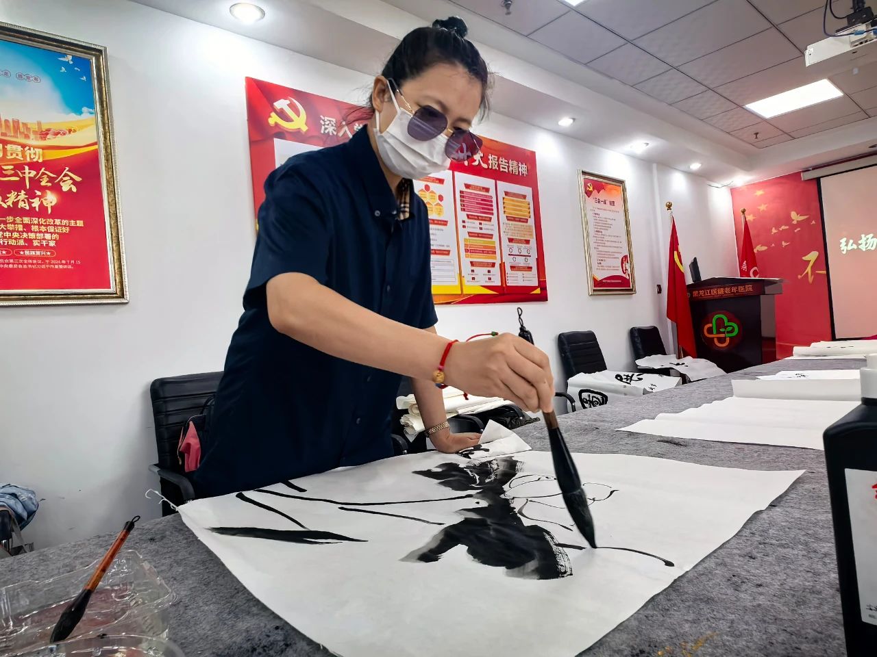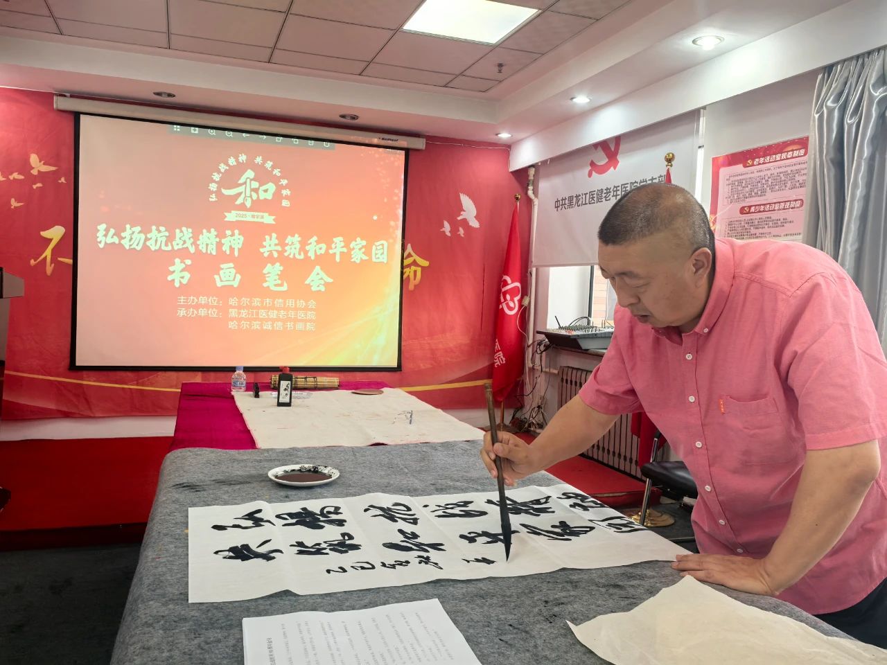 為紀(jì)念抗日戰(zhàn)爭暨世界反法西斯戰(zhàn)爭勝利80周年,8月22日,由市信用協(xié)會主辦,市信用協(xié)會醫(yī)療健康委員會、哈爾濱誠信書畫院承辦,紀(jì)念抗日戰(zhàn)爭暨世界反法西斯戰(zhàn)爭勝利80周年書畫筆會,在黑龍江醫(yī)健老年醫(yī)院拉開帷幕。市信用協(xié)會會長樊勇、黨支部書記賀青、常務(wù)副會長劉鐵華、秘書長王剛、常務(wù)理事、醫(yī)療健康委員會會長林金海、醫(yī)療健康委員會秘書長陳國松等出席書畫筆會。
