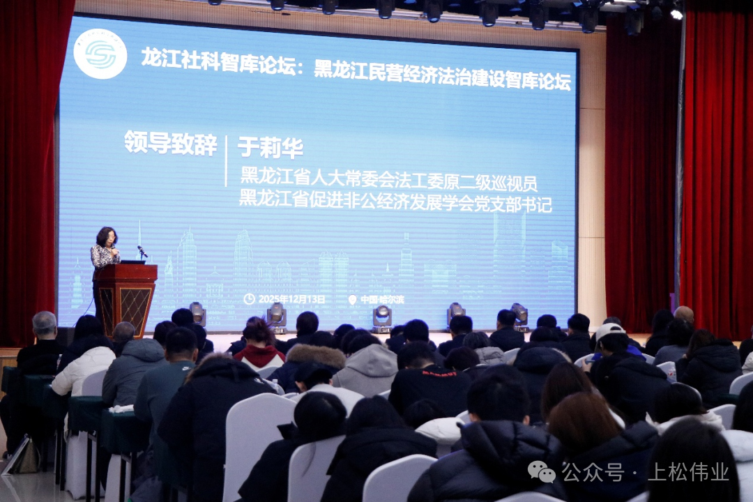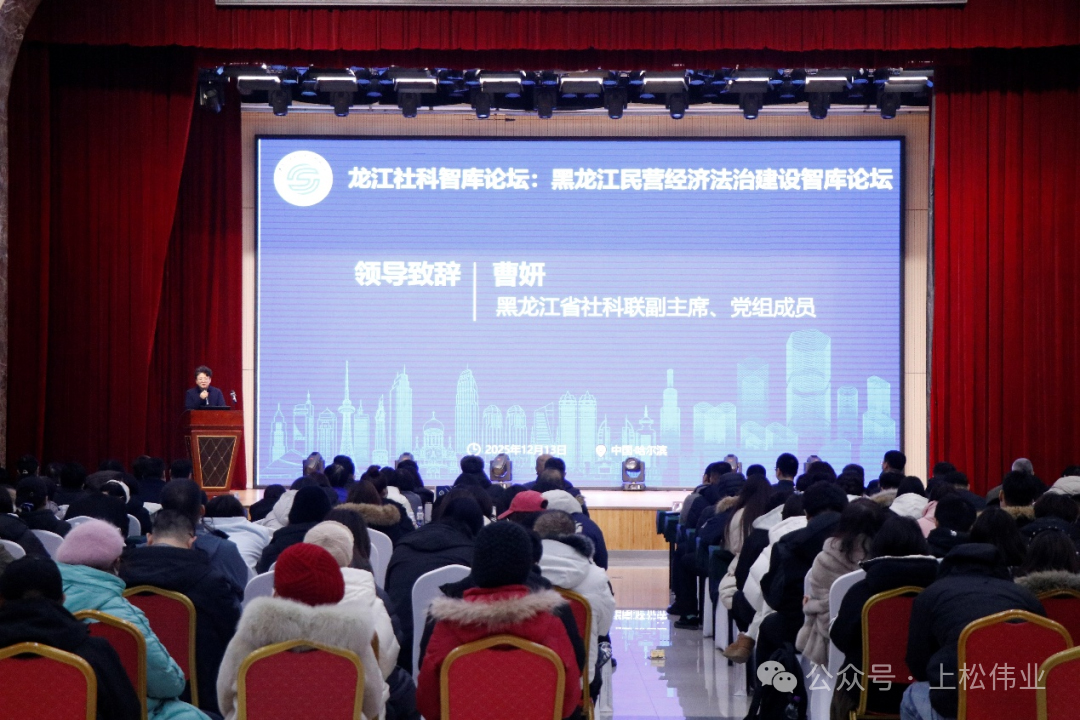 2025年12月13日,龍江社科智庫論壇—黑龍江民營經濟法治建設智庫論壇暨黑龍江省促進非公經濟發展學會學術年會在哈爾濱職業技術大學隆重舉辦。本次會議由省社科聯指導,省促進非公經濟發展學會、哈爾濱職業技術大學、哈爾濱仲裁委員會聯合主辦,哈爾濱職業技術大學創業學院、哈爾濱商業大學法學院、哈爾濱理工大學經濟與管理學院承辦以及多家單位協辦。來自全省政界、學界、企業界、法律界各界代表人士共計300多人參加會議。省社科聯副主席、黨組成員曹妍,省人大常委會法工委副主任楊立峰、省政協文史委副主任李巖,哈爾濱職業技術大學黨委副書記、校長劉建國,以及我公司總經理陳國松、辦公室主任金慧亭等出席會議。會議由省促進非公經濟發展學會常務副會長兼秘書長姚勇民主持。