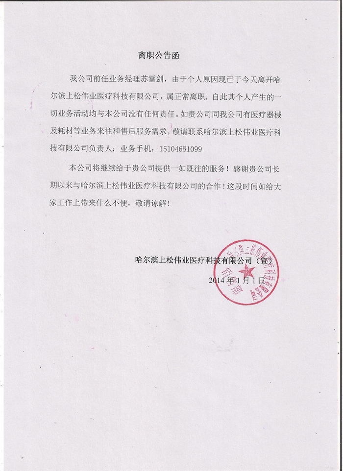 哈爾濱上松偉業醫療科技有限公司 傳真:0451-82280266 地址:黑龍江省哈爾濱市南崗區紅旗大街170號海格孵化基地8層