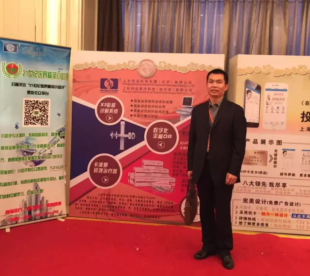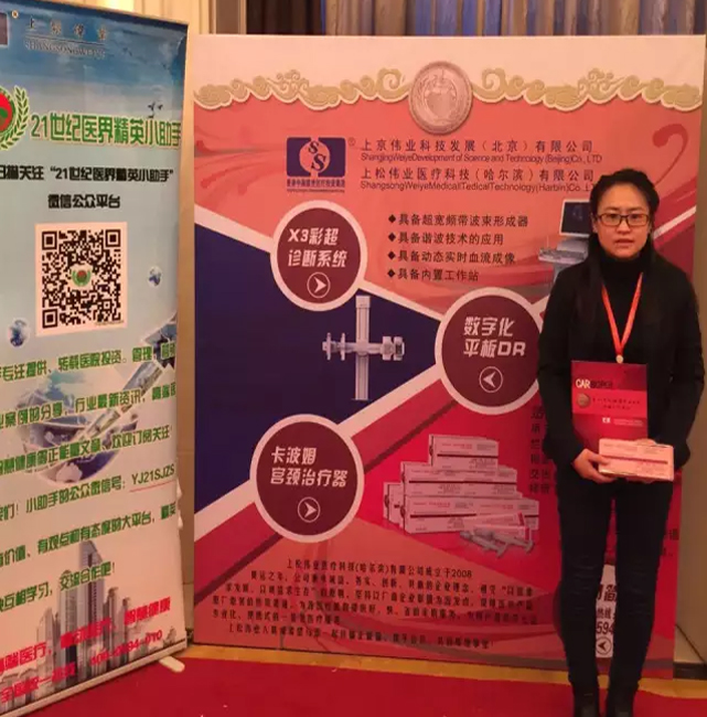 東北區銷售經理張婷女士手拿公司資料手冊與公司主打產品卡波姆宮頸治療器在展板前合影