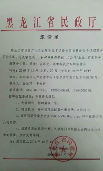 哈爾濱上松偉業醫療科技有限公司受邀參加了此次招聘會,尋找與我們志同道合的人才。得到了良好的反響!