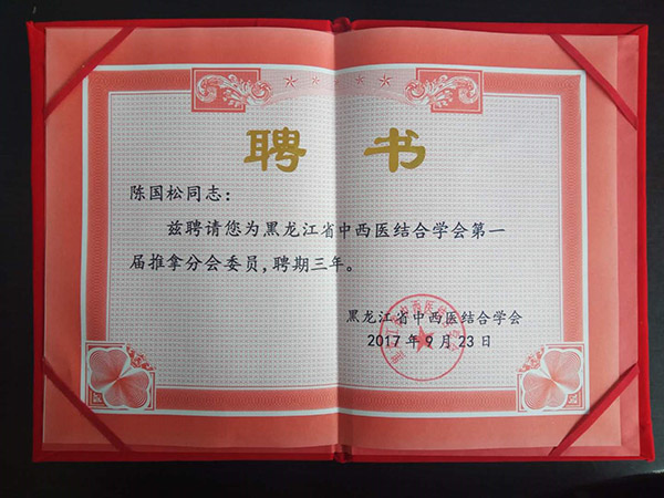 黑龍江省中西醫結合學會第一屆推拿分會委員證書