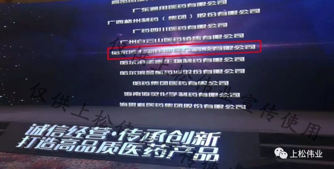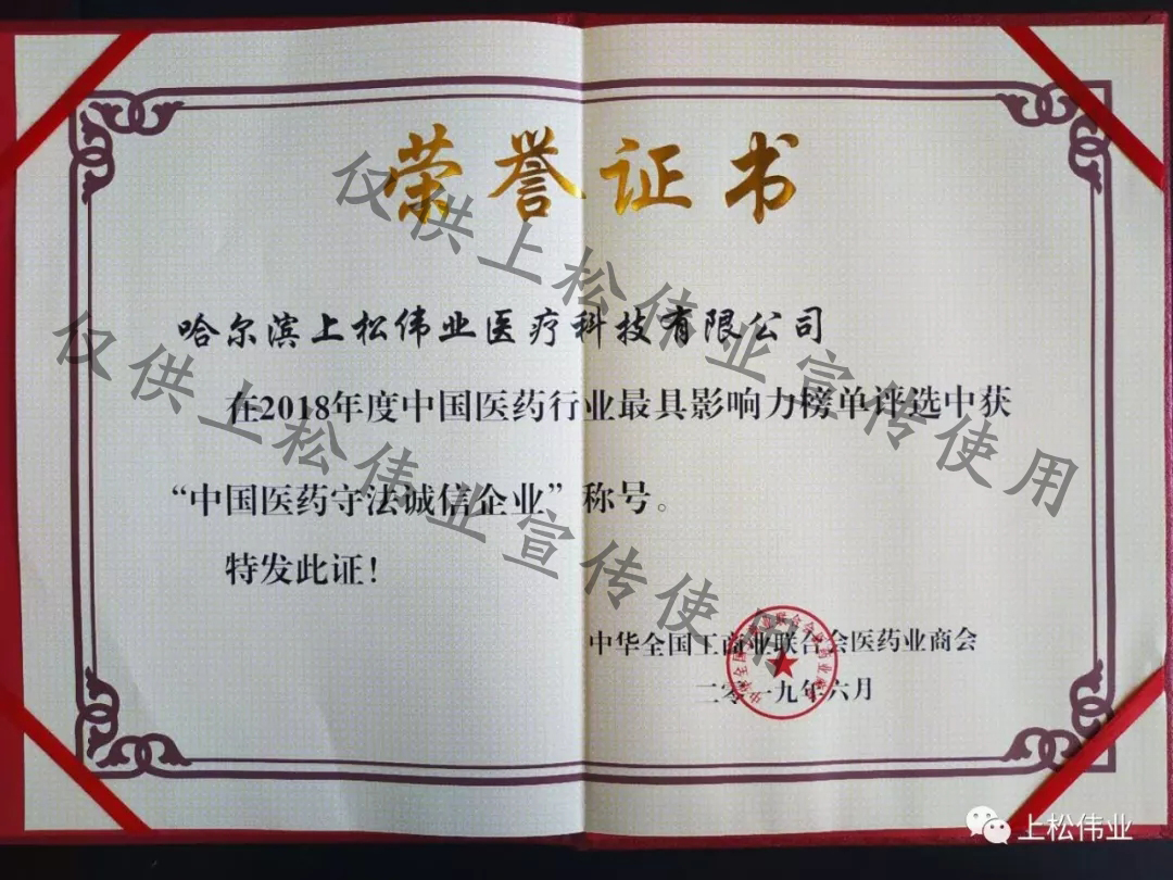 哈爾濱上松偉業醫療科技有限公司再次榮獲“中國醫藥守法誠信企業”稱號。