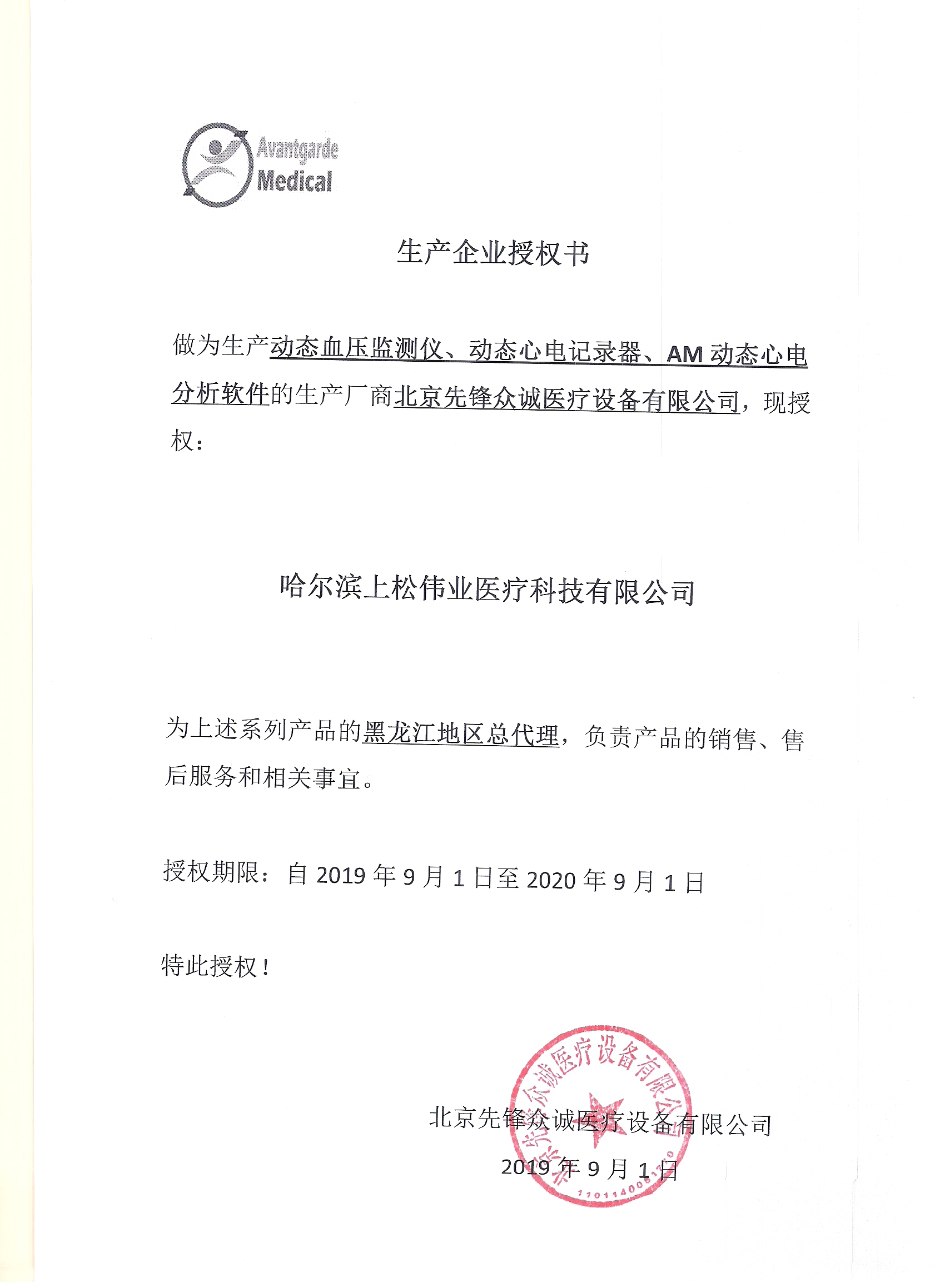 北京先鋒眾誠醫療設備有限公司授權