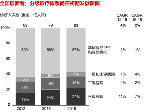 貝恩公司曾根據衛健委公開數據統計發現,我國2018年的基層就醫診療占總比為57%,相較2012年下降了6個百分點。可見當前仍有不少民眾就醫時依然傾向于大醫院,基層醫療機構的公信力有待提高。