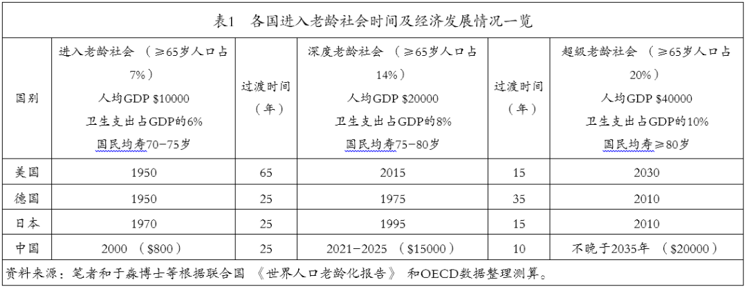 一個國家的醫(yī)療保障水平應(yīng)與該國經(jīng)濟(jì)社會發(fā)展水平相適應(yīng)。中國在2000年前進(jìn)入老齡社會,人均GDP在2019年達(dá)到1萬美元。筆者此前曾經(jīng)做過測算,2021-2025年,中國將從人口老齡化的初級階段進(jìn)入中級階段,屆時人均GDP有望達(dá)到1.5萬美元;2035年以前,中國將進(jìn)入超級老齡社會階段,彼時人均GDP將達(dá)到2萬美元(見表1)。