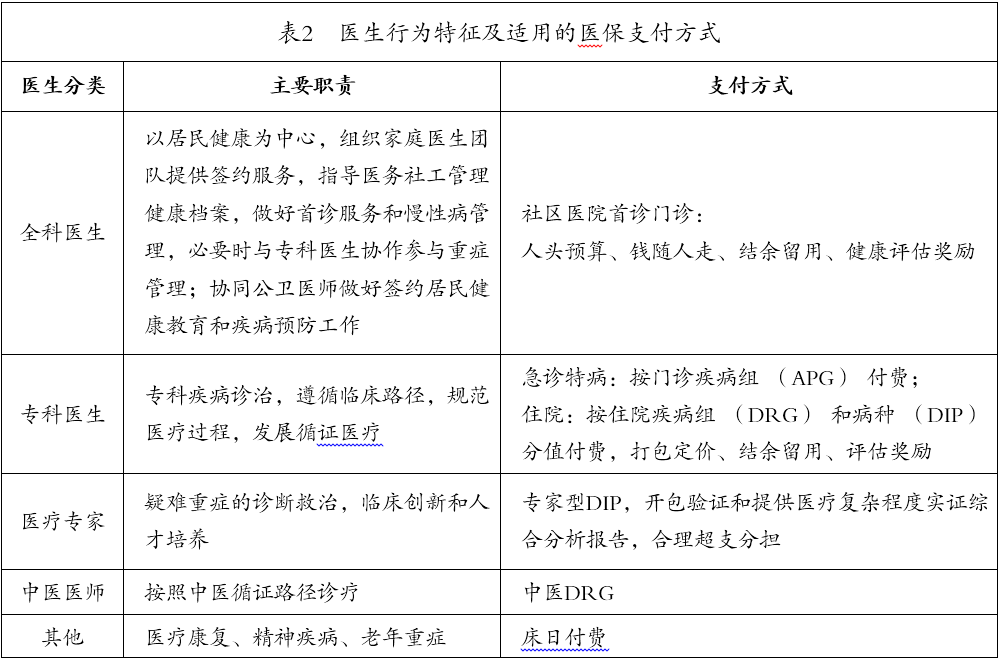 在推行醫(yī)保基金年度總額預(yù)算時,一是要科學(xué)制定并預(yù)先公布預(yù)算總額、支付標(biāo)準(zhǔn)、評估指標(biāo)和預(yù)付資金比例,為醫(yī)院開展預(yù)算和成本核算工作創(chuàng)造條件;二是根據(jù)全科醫(yī)生、專科醫(yī)生和醫(yī)療專家的行為方式,制定和完善多元復(fù)合式醫(yī)保支付方式(見表2),有效發(fā)揮醫(yī)保支付的補(bǔ)償和激勵作用;三是探索建立醫(yī)聯(lián)體支付方式,基層緊密型法人醫(yī)聯(lián)體應(yīng)做好人頭預(yù)算和健康評估工作(金華、深圳等地已經(jīng)做到微觀預(yù)算到個人),松散型專科醫(yī)生聯(lián)盟則應(yīng)積極探索重癥跨院DRG的支付方式。