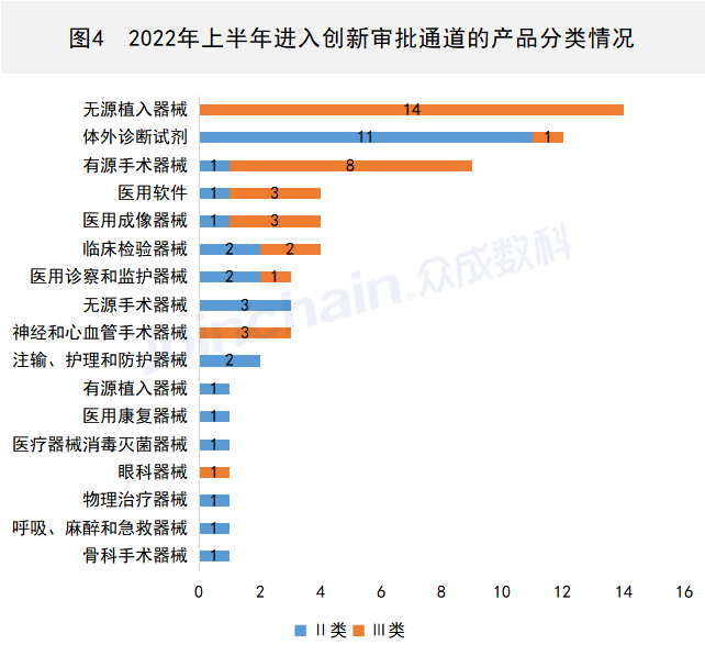 從產(chǎn)品類型來看,無源植入器械共有14件Ⅲ類產(chǎn)品進(jìn)入創(chuàng)新審批通道,體外診斷試劑分別有11件Ⅱ類產(chǎn)品和1件Ⅲ類產(chǎn)品進(jìn)入創(chuàng)新審批通道,有源手術(shù)器械分別有1件Ⅱ類產(chǎn)品和8件Ⅲ類產(chǎn)品進(jìn)入創(chuàng)新審批通道。