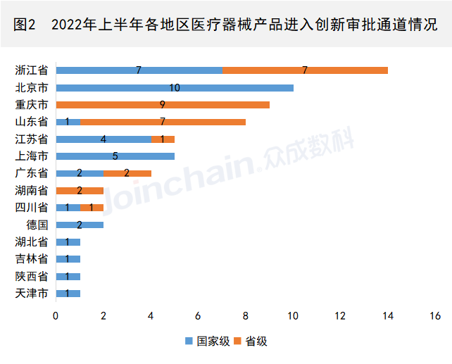 從區(qū)域分布來看,2022年上半年進(jìn)入創(chuàng)新審批通道的產(chǎn)品中,63件為國產(chǎn)產(chǎn)品,2件為進(jìn)口產(chǎn)品。其中產(chǎn)品數(shù)量位列前三的省市分別為浙江省(14件)、北京市(10件)和重慶市(9件)。