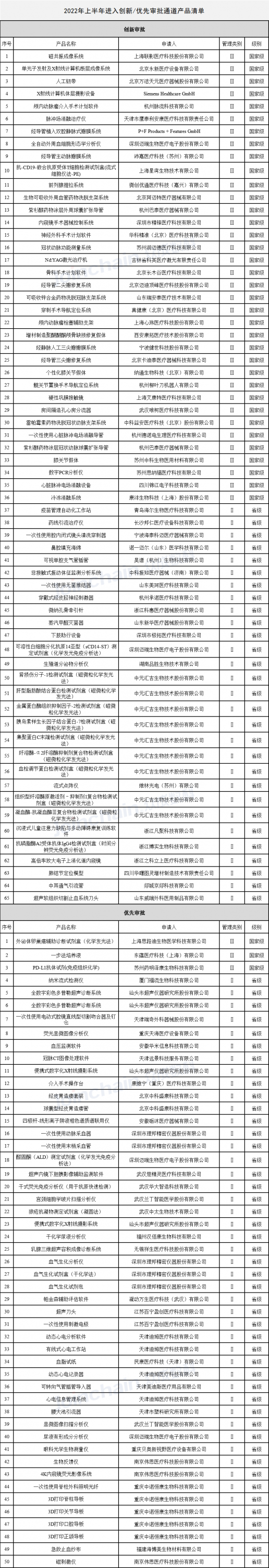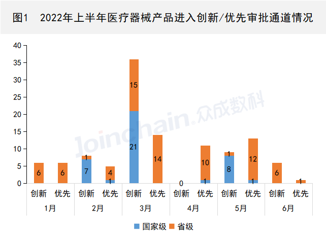據(jù)眾成數(shù)科(JOINCHAIN)統(tǒng)計(jì),2022年上半年,共計(jì)55家企業(yè)的65件產(chǎn)品進(jìn)入創(chuàng)新醫(yī)療器械特別審批通道,其中36件產(chǎn)品進(jìn)入國家級(jí)創(chuàng)新審批通道,29件產(chǎn)品進(jìn)入省級(jí)創(chuàng)新審批通道;共計(jì)30家企業(yè)的50件產(chǎn)品進(jìn)入優(yōu)先審批通道,其中3件產(chǎn)品進(jìn)入國家級(jí)優(yōu)先審批通道,47件產(chǎn)品進(jìn)入省級(jí)優(yōu)先審批通道。(產(chǎn)品清單見附表1)