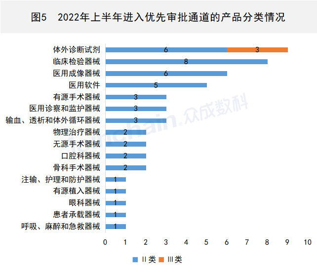 進(jìn)入優(yōu)先審批通道的產(chǎn)品中,產(chǎn)品數(shù)量前三的產(chǎn)品類別分別是體外診斷試劑(9件)、臨床檢驗(yàn)器械(8件)和醫(yī)用成像器械(6件),其中僅有體外診斷試劑類含有Ⅲ類產(chǎn)品,數(shù)量為3件。