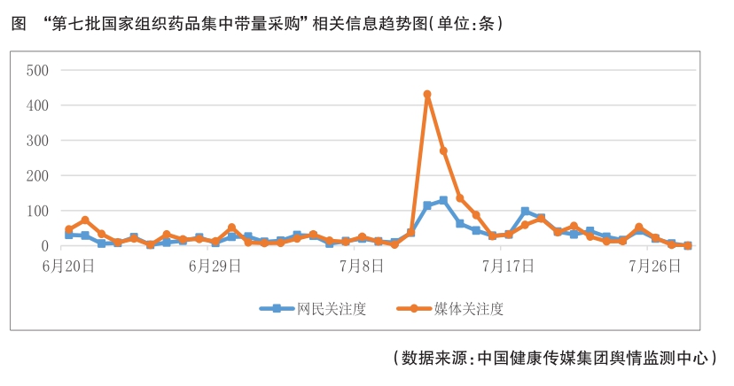 6月20日至7月28日,中國健康傳媒集團食品藥品輿情監測系統對主流媒體、全國性門戶網站、微博、微信等平臺進行監測發現,“第七批國家組織藥品集中帶量采購”相關話題受到輿論較多關注,相關輿情熱度較高。