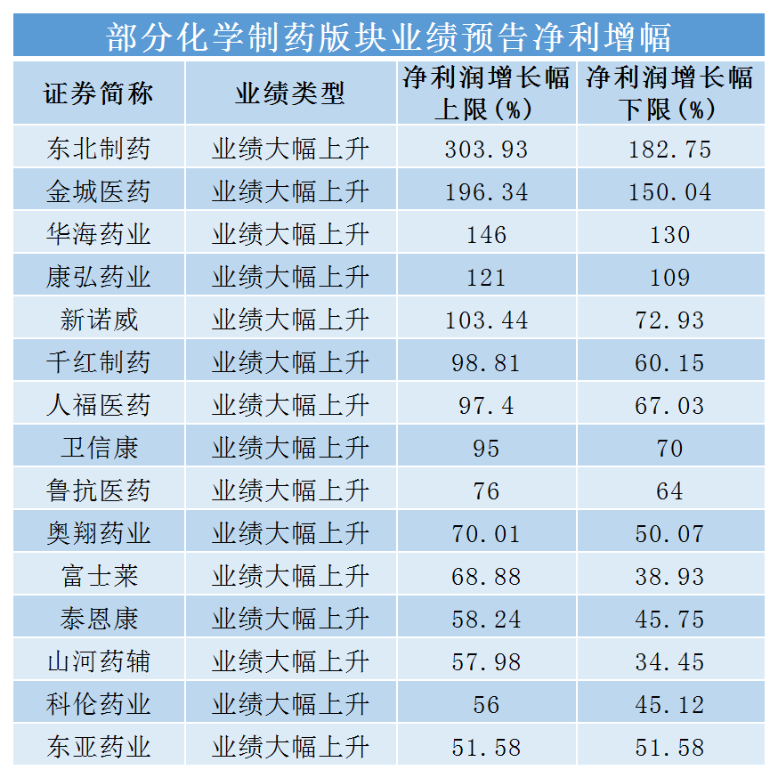 部分化學(xué)制藥板塊業(yè)績預(yù)告凈利潤增幅
