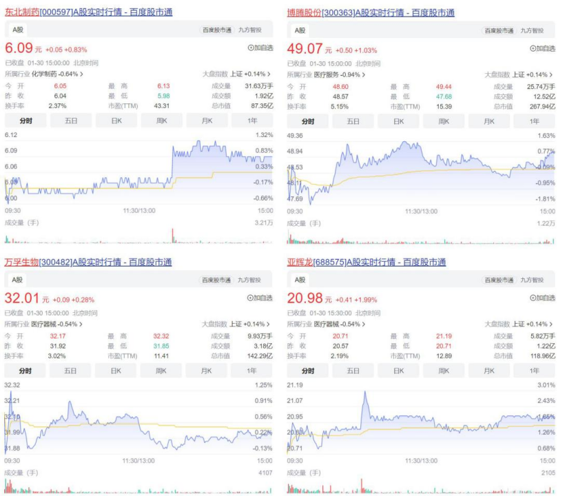 具體來看,業(yè)績預(yù)增的企業(yè)超過60家,占比超過5成,其中預(yù)計業(yè)績大幅上升的企業(yè)超過40家,凈利潤增幅最大的是嘉應(yīng)制藥,最高或達3419.94%,九安醫(yī)療緊隨其后,預(yù)計增幅上限為1825.95%,亞輝龍、方盛制藥、博騰股份、東北制藥這4家企業(yè)的凈利潤增幅也同樣超過300%。此外,凈利潤增幅在100%~300%區(qū)間的企業(yè)有16家,這些企業(yè)在今天的股票交易中也表現(xiàn)活躍,部分上市公司股價迎來“開門紅”。