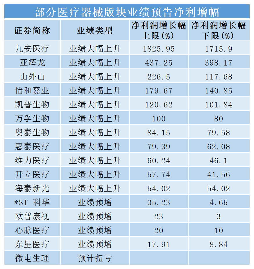 部分醫(yī)療器械板塊企業(yè)業(yè)績預(yù)告凈利潤增幅