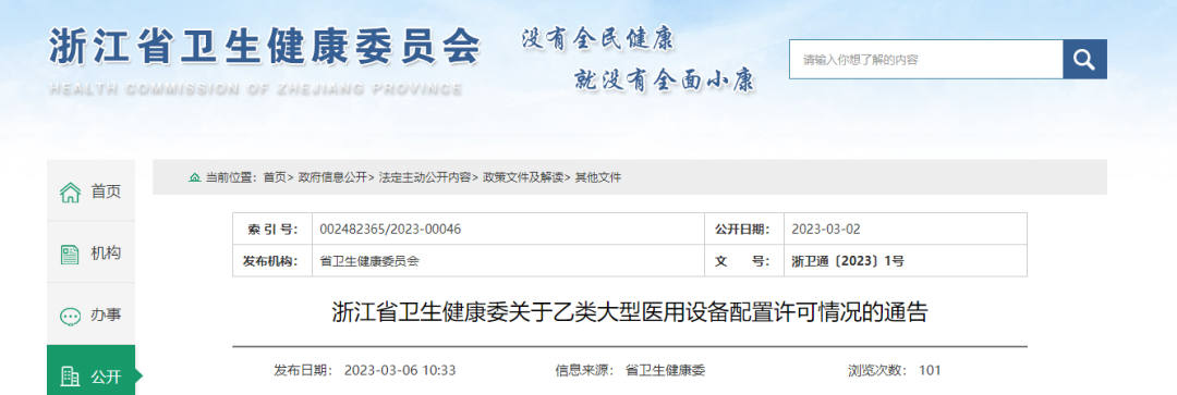 近日,浙江省衛健委發布《關于乙類大型醫用設備配置許可情況的通告》,對2022年第四季度乙類大型醫用設備配置申請許可情況作出公布。